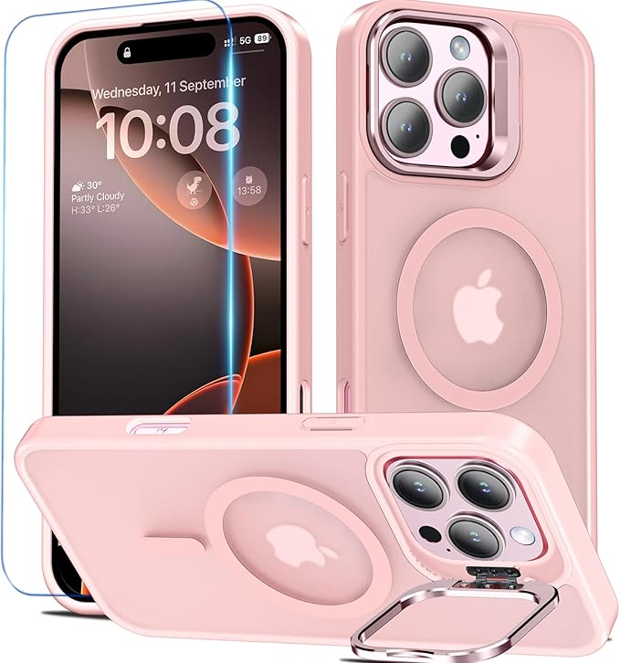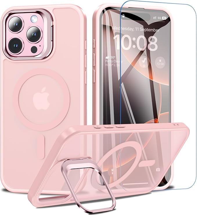 BESINPO iPhone 16 Pro Max ケース [ガラスフィルム付き・MagSafe対応・スタンド機能] アイフォン16プロマックス ケース 縦横両対応 調整可能 半透明 黄ばみなし 指紋防止 いphone16promax ケース 米軍規格 耐衝撃 耐久性 マグネット搭載 マグセーフ対応 ストラップホール iPhone 16 Pro Max ケース 6.9インチ対応 ピンク