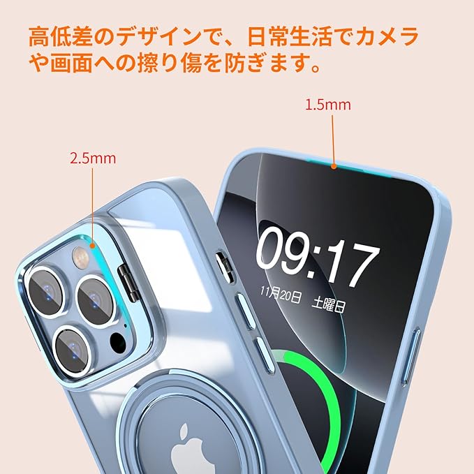 iPhone 13 Pro Max 用 ケース リング レンズスタンド内蔵 縦横両対応 透明 iPhone本体色 黄ばみ防止 ワイヤレス充電 いphone13 Pro Max スマホケース 米軍規格 耐衝撃 携帯カバー アイフォン 13 Pro Max ケース マグネット搭載 車載ホルダー マグセーフ対応 おしゃれ シエラブルー