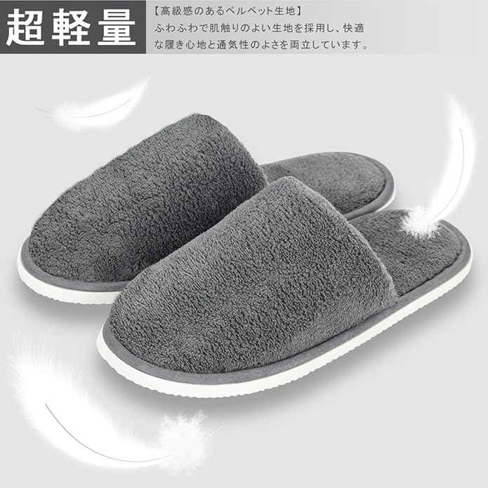 来客用に使えるものが欲しい方は、この高級感のあるベルベットをおすすめします。普段使いできそうなほど見た目がしっかりしており、肌触りも良好。底も厚めで使い捨てっぽさがありません。 個別包装されていて保管しやすく、携帯にも便利。必要なときにバッグにサッと入れて持ち出すことができます。ちなみに、旅行や出張などの際、飛行機だけでなくホテルでも使うというような場合は、収納袋付きで何度か履けますよ。 底面にEVAシートを取り付けて滑りを防止、 スリッパの底面に凹凸付きの滑り防止EVAシートを採用し、フローリングの上も歩きやすいです。