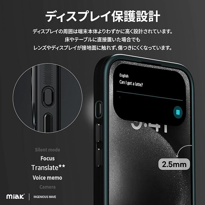 iPhoneの画面が床に直接触れないようにケースの縁をディスプレイより高く設計し、スクラッチなどから保護します。