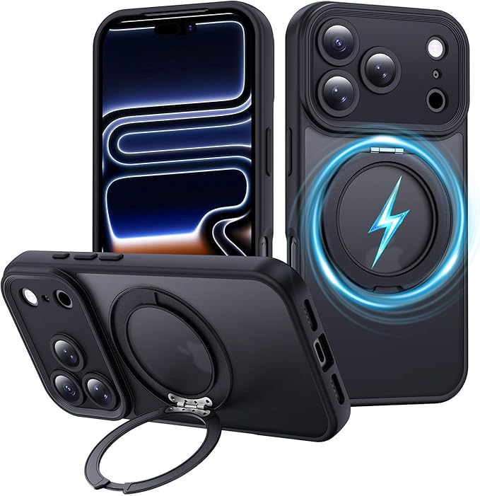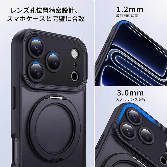 Aunote いphone17pro max ケース 精密カメラ保護 360 回転スタンド MagSafe対応 薄型 軽量 米軍MIL規格 耐衝撃 黄変防止 スマホケース iPhone17promax ケース カバー ブラック