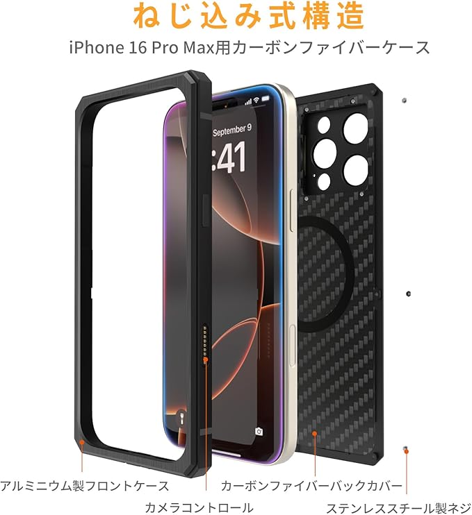 高級素材:背面カバーに本物のカーボンファイバーを使用し、軽量のアルミニウム金属フレームを採用した iPhone 16 Pro Max ケースはユニークで傑出したものになります。