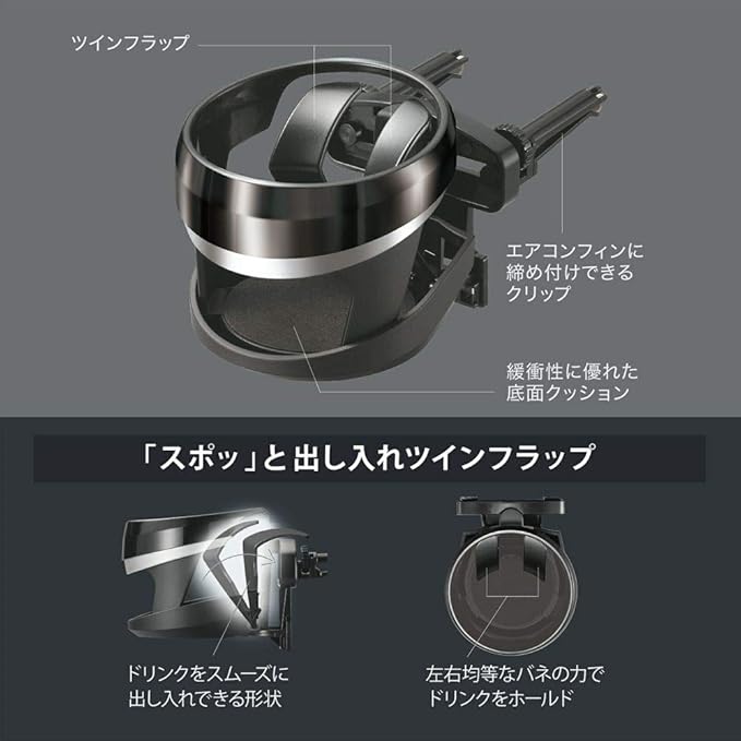 可動式のフラップにより、細缶(径52mm)から太めのペットボトル(径74mm)がホールド可能です。コイルスプリングを採用した樹脂バネは、ドリンク容器を出し入れする際に力を込める必要がなく、快適に使用することができます。