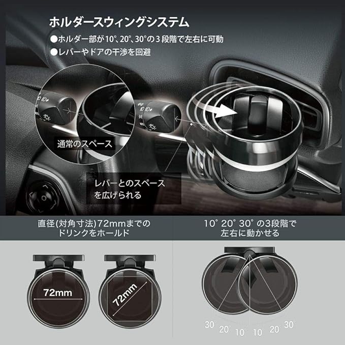 ホルダー部が水平方向に10 、20 、30 の3段階動かすことができ、ウィンカーレバーやドアノブへの干渉を避けることができます。多様なドリンク容器に対応しています。