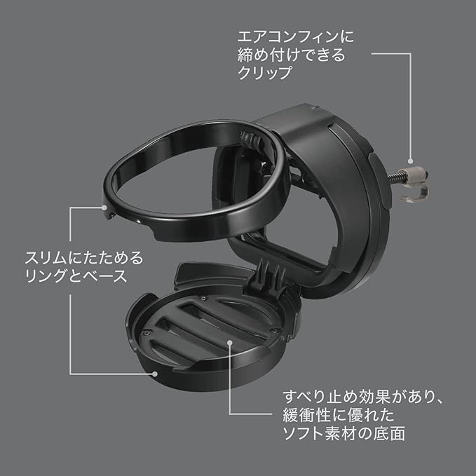 丸型エアコンダクトにスッキリとインストールできるデザインで、折りたたむと製品正面がエアコンフィンのようなデザインになるドリンクホルダーです。