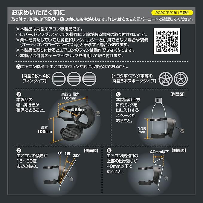 ●本製品の幅・奥行き・高さが確保でき、本製品の上方にドリンク容器を出し入れできるスペースが確保できることを確認してください。●製品取付部の上方に、40mmを超える内装の出っ張りがないこと。●取付面の傾きが、垂直から15~30度傾斜していること。●レバー・ドアノブ・スイッチの操作に支障がある場合は取付けないこと。●本製品を取り付けると、車両のエアコンフィンの操作はできなくなります。
