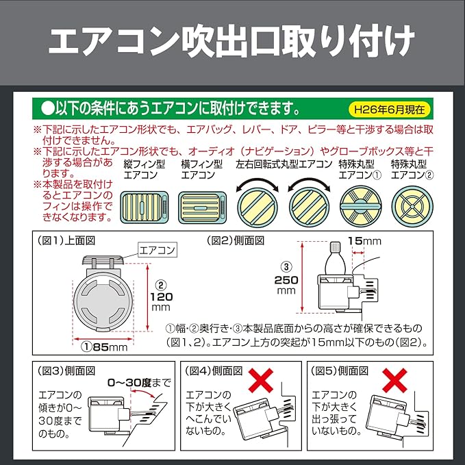 ●エアバックの作動や運転の妨げになる場所には取付けないこと。●ドリンクを置いた状態で放置しないこと。高温でフィンが損傷することがあります。●600mlを超えるドリンクは置かないこと。本製品やフィンが損傷します。●熱で変形、変質したり、破裂するおそれのある物(ガスライター・エアゾール製品)は置かないこと。悪路走行時やドリンク容器やカップ容器の形状によっては安定しない場合があります。安定性を確認のうえ、使用すること。●ドリンク容器やカップ容器の形状・材質によっては、出し入れしづらい場合があります。その場合、停車時にホルダー本体を押さえながら出し入れしてください。