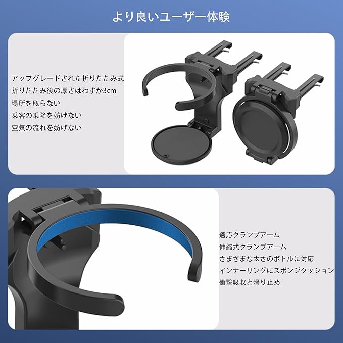 スマートな収納で車内スッキリ:使用後はコンパクトに折りたたんで収納可能。カップホルダー不足時にすぐ展開でき、車内の美観を損ないません。運転席周りを整理整頓したい方に最適です。