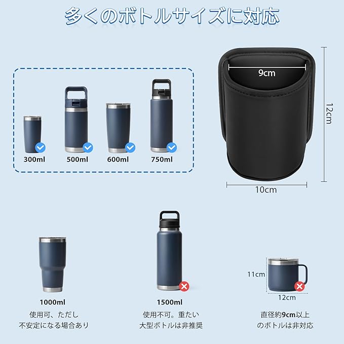 【直径9cm 深さ12cm|車用ドリンクホルダー増設・深型設計】浅型の車用ドリンクホルダーでは揺れやすく、ドリンクがこぼれやすいという不満を解消。直径約9cm・深さ約12cmの深型カップホルダー設計で、コンビニコーヒー、スポーツボトル、タンブラーなど幅広いドリンクに対応する。車用・増設用ドリンクホルダーとして後部座席の飲み物置きに最適で、小型ゴミ箱や小物収納ボックスとしても使用可能。車内の収納スペース不足の悩みを解消する。