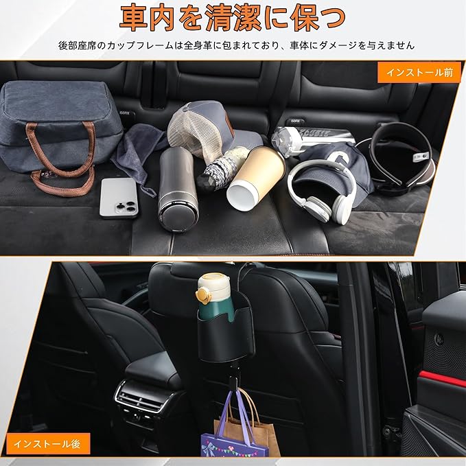 車体を保護する:車用カップフレームは全皮革で包む設計を採用し、プラスチックより柔らかく、車体にスクラッチなどの損傷を与えない。耐摩耗性で清掃が容易である、耐用年数が長い.下方フックは金属フックを採用し、荷重能力が強く、壊れにくい。