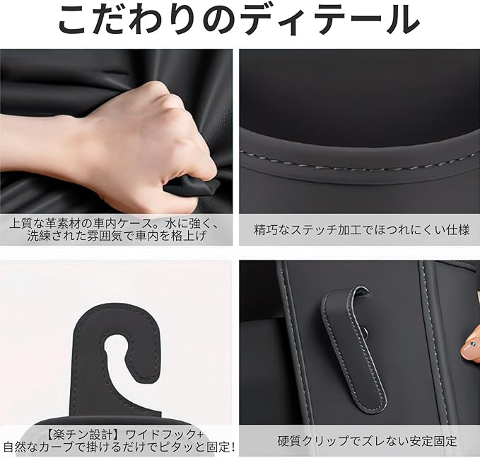【高品質素材と洗練デザイン】上質な合成皮革を使用し、柔軟性と耐久性を両立。長期間使用しても型崩れせず、汚れも拭き取りやすいです。落ち着いたブラックとマット質感が、あらゆる車種の内装に調和し、シンプルながら上品な雰囲気を演出します。