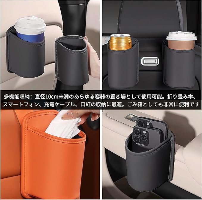 【多機能】ドリンクホルダーとしてだけでなく、スマートフォン・ガム・傘・カードなどの小物収納や、簡易ゴミ箱としても便利。車内の散らかりを解消し、快適な空間を保ちます。