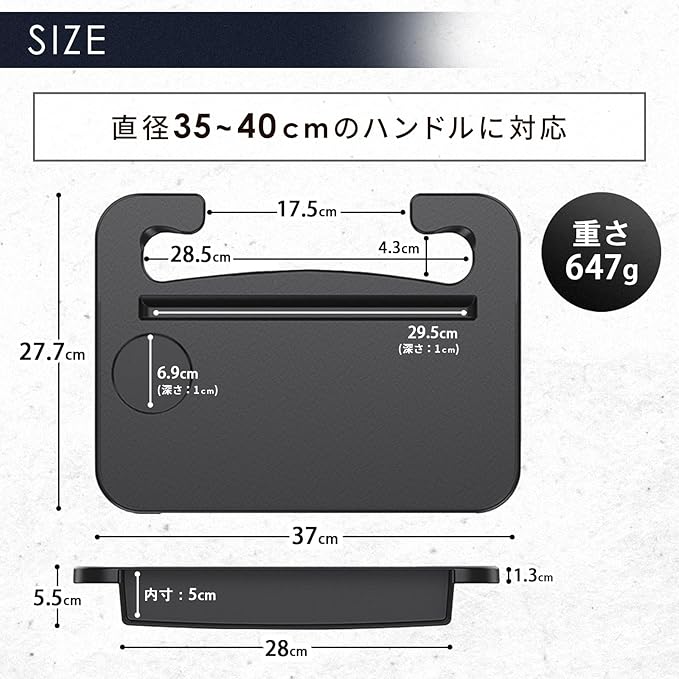 【サイズ情報】本体サイズ:横幅37cm 縦27.7cm 高さ5.5cm/重量647g。直径35〜40cmの一般的な円型ハンドルに対応し、多くの車種で使用できます。