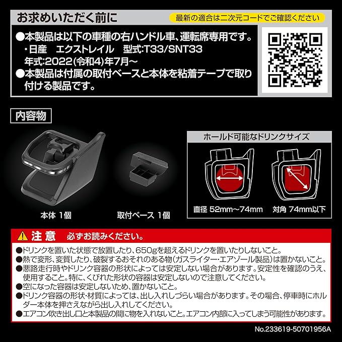 T33系エクストレイル(2022(令和4)年7月~)の右ハンドル車、運転席側専用に設計・デザインされたドリンクホルダーです。