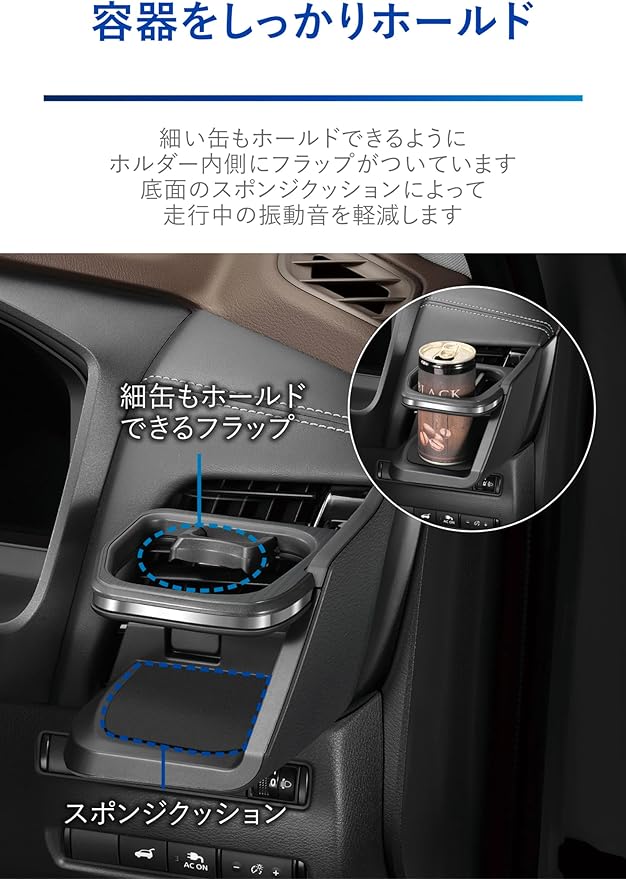 ●専用設計ならではのこだわり ~エアコンの風向き(左右)が調整できる~ 専用の取り付け構造にすることで、エアコンフィンの左右の向きを調整できるようにしています。ドリンクホルダーとエアコンフィンの間に指が入るスペースを設けることで、エアコンフィンを操作できるようにデザインしました。 また、エアコンの風によってドリンクを保温したり保冷したりすることができます。