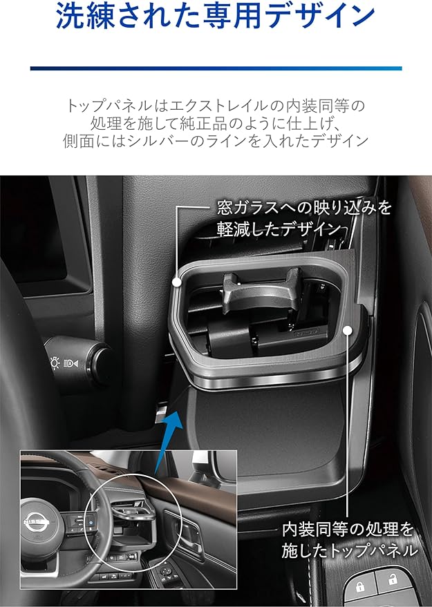 エクストレイル専用デザインなので、トップフレームにはヘアライン加工を施し側面にはインテリアに合わせたシルバーのラインを入れ、サイドパネルには内装に合わせて調色した樹脂に革シボ調加工を施すことでエクストレイルの内装にマッチする仕上がりにしています。(特別仕様車などを除く)