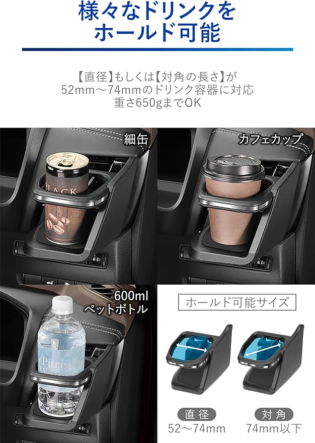 上から見た時に【直径】もしくは【対角の長さ】が52~74mmのドリンク容器に対応しています。(底から上部にかけて広がるカフェカップやチルドカップ等の場合、底から72mmの位置でのサイズが74mm以下であること。) また、缶コーヒーなどの細い缶も安定させるためホルダー内側にフラップが付いています。