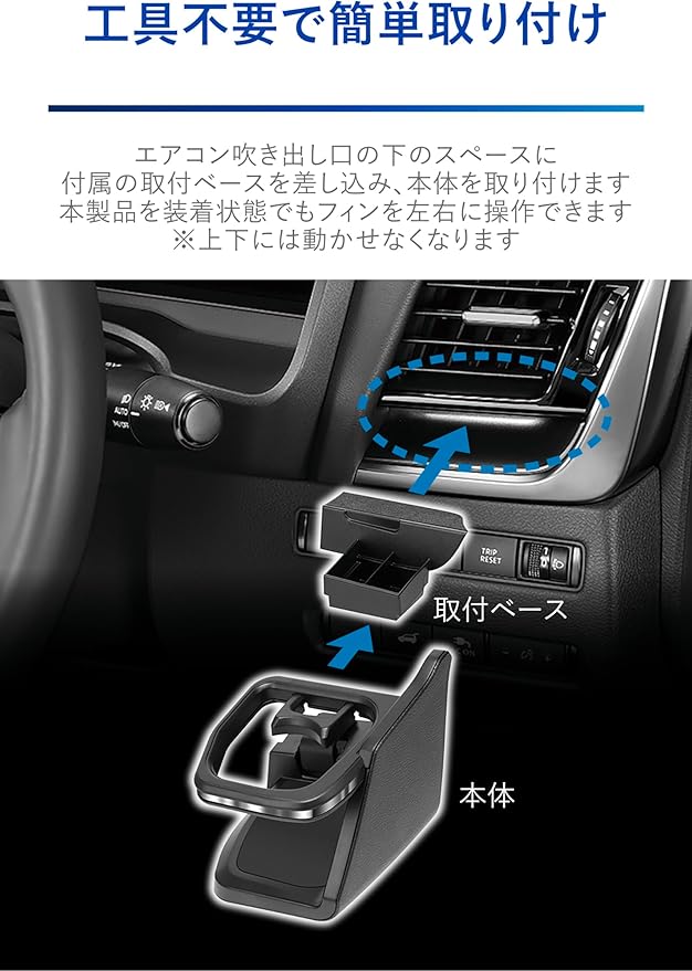 ●工具不要でカンタン取り付け(取り付け所要時間の目安:3分) エアコン吹き出し口下のスペースに付属の取付ベースを貼り付け、取付ベースと一番下のエアコンフィンに本体のフックが引っかかるように取り付けます。工具不要なため、カンタンに取り付けることができます。 また、専用の設計なので内装にキズが付いたり、取り付け跡が残ったりしない取り付けが可能です。