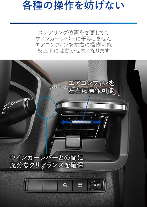 ●専用設計ならではのこだわり ~ウィンカーレバーとの干渉を避ける取付位置~ エアコン吹き出し口に取り付ける一般的なエアコン取り付けのドリンクホルダーは、ステアリングの位置によっては本体がウィンカーレバーと近くなり運転しづらくなることがあります。専用設計のためウィンカーレバーとの干渉を避けるベストなポジションに設置でき、ステアリングがどの位置になっても運転の妨げになりません。