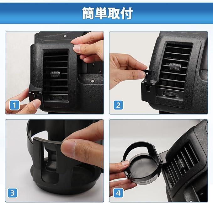 5.【ピッタリ&取付簡単】:現車採寸を施したので最高のフィット感を実現し、強力で粘着跡が残らない両面テープも付属しているため、安定感は抜群です!運転席および助手席のエアコン送風口パネルに固定ベースを押し当て、接続パーツでドリンクホルダー本体をベースに取り付けるだけで簡単に装着できます。