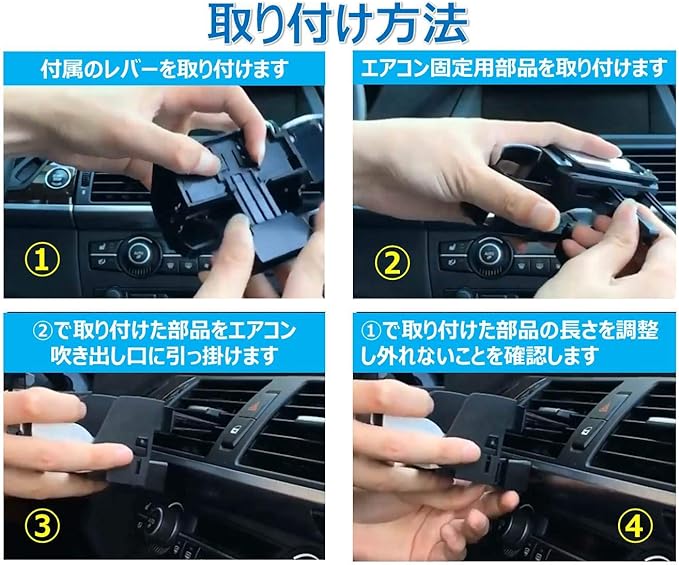 簡単取り付け:付属の部品を取り付け、エアコン吹き出し口に装着するだけの簡単設置です。小物入れはスタイルに応じて取り外しも可能です。