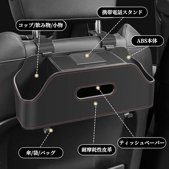 【車用多機能収納ボックス】:このカーオーガナイザーは、多用途に使えるカーアクセサリーです。ティッシュホルダー、スマートフォンホルダーが一体化しており、2つのカップホルダー。ドリンク缶やコーヒーカップの収納、スマートフォンやタブレットの収納など、車内でのあらゆるニーズに応えます。