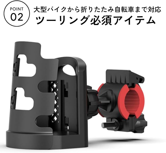 【簡単・確実・長持ち】取り付けはバーに合わせて位置調整しネジを締めるだけ。3段階クランプと360度回転機構で自由なレイアウトが可能です。ABS高耐久素材と精巧な作りが、長く使える安心感を提供。自転車・スクーター・バイクに幅広く対応し、ペットボトル、缶、カフェカップなど多様な飲み物を安全に持ち運べます。