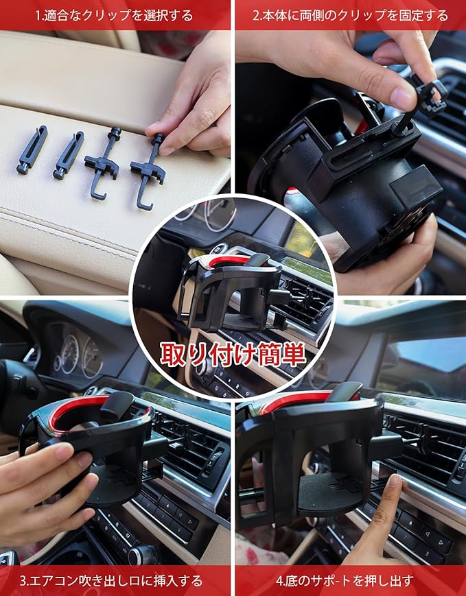 【取り付け簡単】ドリンクホルダーのスプリングは、あらゆる種類のカップに適しており小さなカップでも揺れません。 ①適合なクリップを選択する。②本体に両側のクリップを固定する。③エアコン吹き出し口に挿入する。④底のサポートを押し出す。
