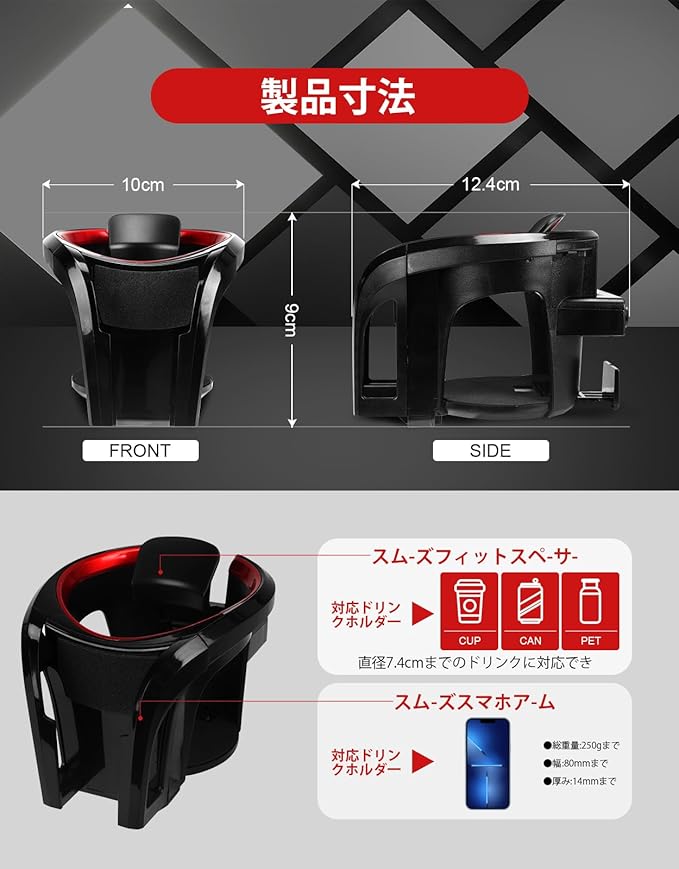 【高品質素材】:車用ドリンクルダーは高品質のABS素材で作られており、耐久性と熱伝導性に優れています。 スマホとの接触面にはドリンクの揺れを抑えるゴムパッド、底面には端末を傷つけにくいクッションパッドが付いています。