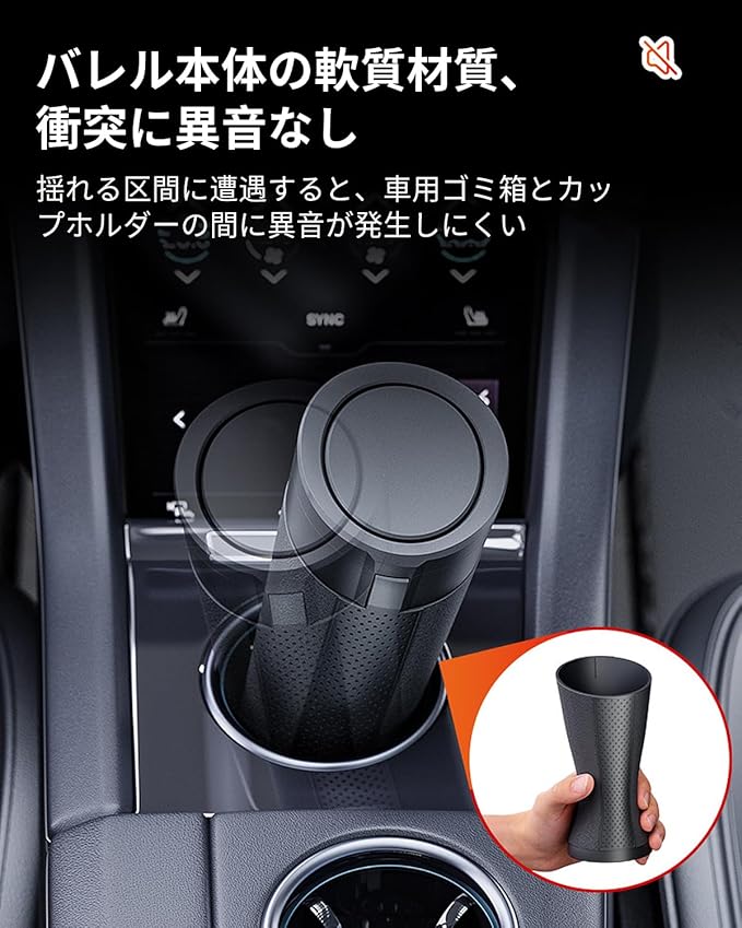 【バレル軟性材質、静かに運転して邪魔しない】揺れる道路で、最もイライラするのは車内の異音の数々だ。この車内ゴミ箱は高品質の軟性材質を用いてバレル本体を製作し、独特の材質特性によりカップホルダーと接触した時、どんなに揺れている区間に遭遇しても、少しも人を悩ます衝突騒音が発生しない。この車用ゴミ箱 コンパクトは静かな守護者のようなもので、静かで快適な運転環境を作り、旅行中に音楽を楽しんだり、家族や友人と気軽に話をしたりすることができ、外出するたびにより快適になることができます。