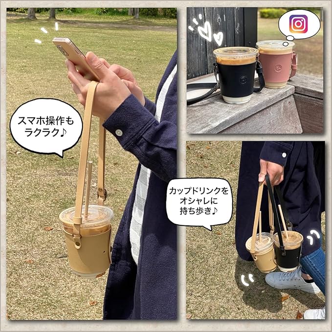 カフェのテイクアウトドリンクやコンビニコーヒーを手軽にオシャレに持ち運べるカップドリンク専用ホルダーです。 持ち歩きに不便な、中〜大サイズカップ専用設計。テイクアウトドリンクを持ちながらの財布の出し入れやスマホの操作もスムーズに行えます。(一部のレギュラーサイズやSサイズ等の小さいカップには対応致しておりません。ご使用するカップサイズをご確認の上お買い求め下さい。) カップの大きさに合わせ、組みネジを移動させる事により3段階のサイズ調節が可能です。(飲み口部分8.5cm~10cmまで対応。)シチュエーションに合わせストラップの長さも約50cm~90cmまで調節できます。 テイクアウトカップドリンク専用のホルダーになります。それ以外のドリンク等には対応しておりません。サイズ調整の際はカップの脱落防止の為、組みネジを手でしっかりと締めて下さい。(カップの形状やサイズによっては使用出来ない場合がございます。) 濡れたり汚れたりした際は、乾いた布で優しく拭き取り日光の当たらない場所で乾燥させて下さい。(PUレザー製)