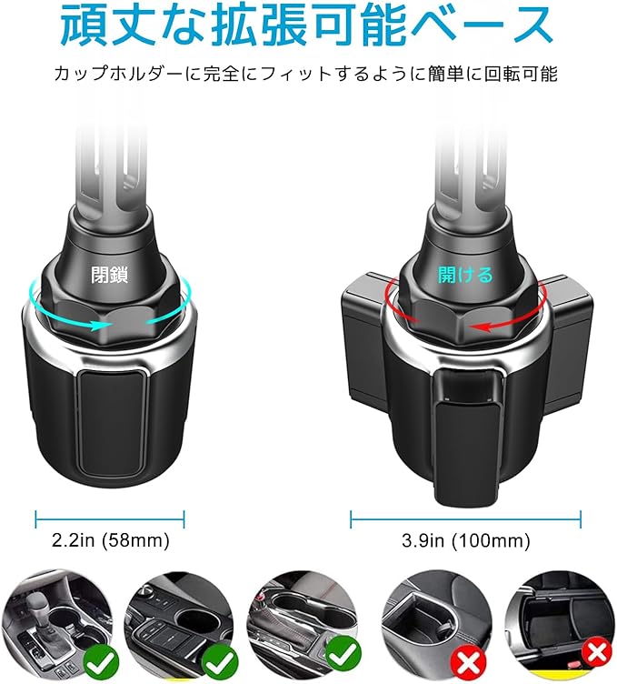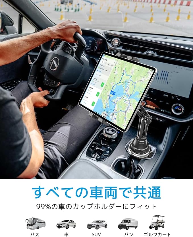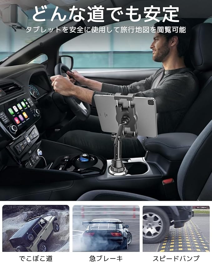 【調整可能なワイドベース】本車載タブレットホルダーは、約58mm〜100mmまで幅を広げられる可変式ベースを採用し、大型の丸型カップホルダーに幅広く対応します。ボート、ゴルフカート、トラック、キャンピングカーなど多様な車両で活躍。柔らかい滑り止めシリコンパッドと耐熱素材により、過酷な気候でもしっかり安定して固定できます。