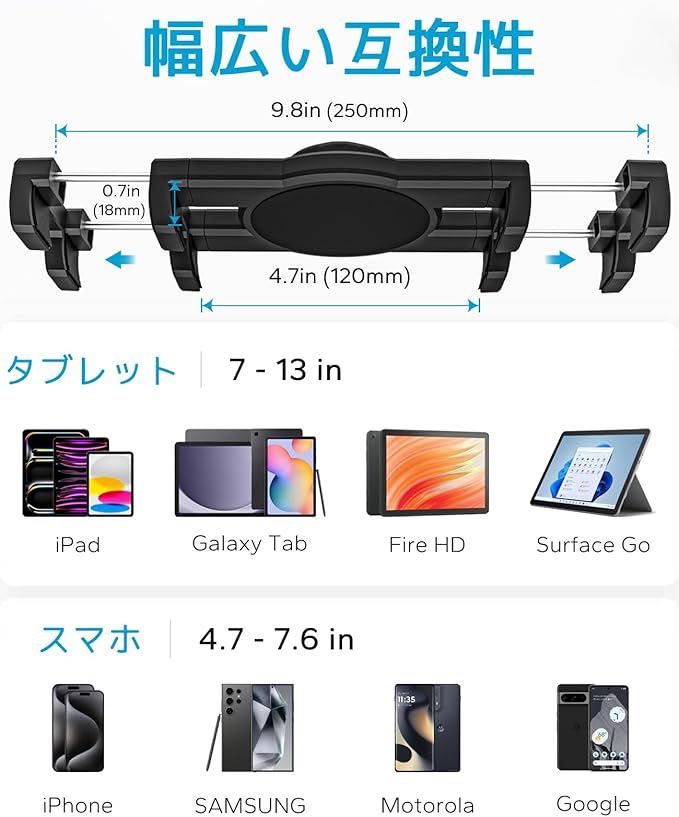 【幅広いデバイスに対応】本車載カップホルダー型タブレットホルダーは、4.7~13インチのタブレット・スマートフォンに幅広く対応。iPad Pro 12.9 / 11 / 10.5 / 10.2 / 9.7、iPad Air(4 / 3 / 2 / 1)、iPad mini(5 / 4 / 3 / 2 / 1)、iPad(第8~1世代)に適合。さらに iPhone 17 / 17 Pro / 17 Pro Max、iPhone 16 / 16 Pro / 16 Pro Max、iPhone 15 / 15 Pro / 15 Pro Max、iPhone 14 / 14 Pro / 14 Pro Max、iPhone SE、iPhone 13 / 12 / XS / XS Max / XR / X / 8 Plus / 8 / 7 / 7 Plus / 6 Plus / 6 にも対応。Galaxy Note 20、S21 / S21+、S20+ / S20 Ultra、S10+、Galaxy Tab、Note シリーズ、S シリーズ、Pixel シリーズなど多数のデバイスに使用できます。