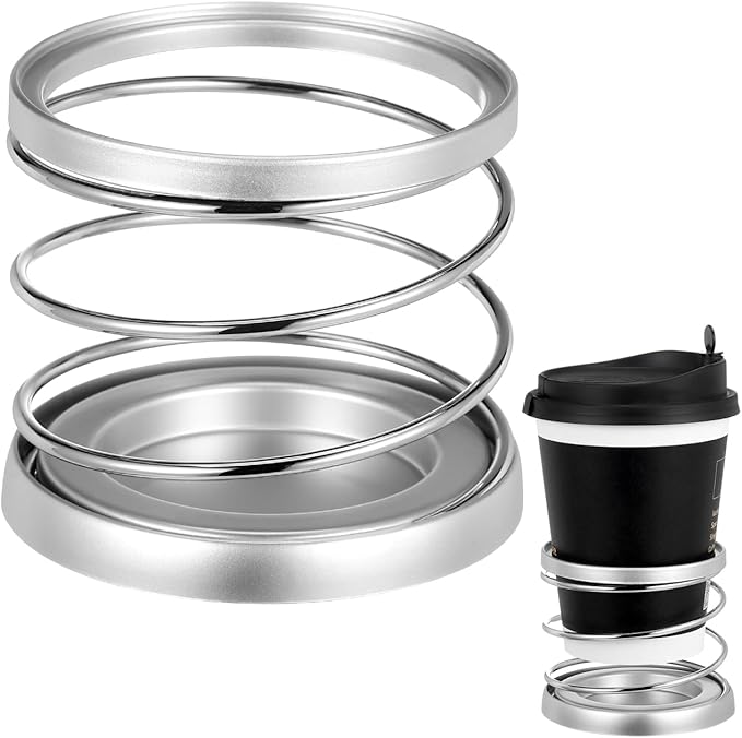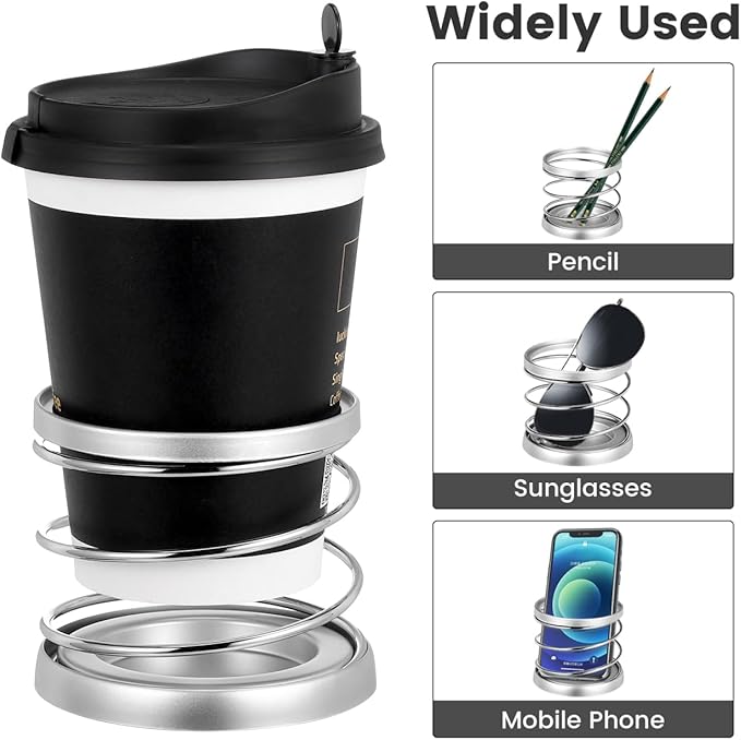 【バネの力で容器をしっかりホールド】 螺旋状のスプリング(コイル)構造を採用した、ユニークで実用的な車用ドリンクホルダーです。バネの適度な弾力が、缶コーヒー、350ml/500mlペットボトル、コンビニのコーヒーカップなど、様々な太さの容器にフィットし、走行中の振動によるカタカタ音や転倒を防ぎます。