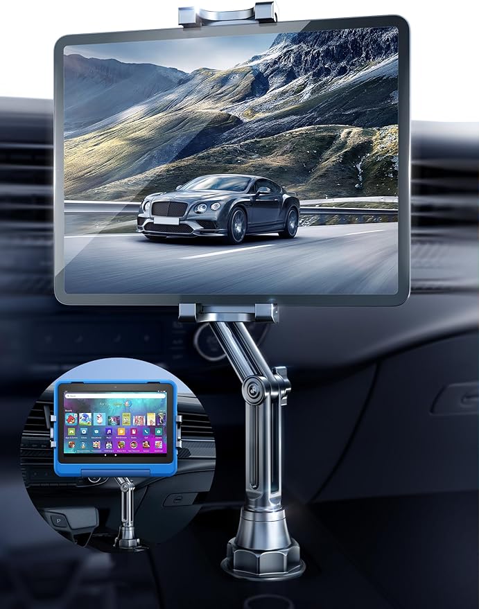 優れた保護と簡単取り付け: 従来の吸盤式やベントクリップ式のマウントとは異なり、このカップホルダー用タブレットマウントはダッシュボードやフロントガラスに接着剤を使用せず、粘着残留物や潜在的な損傷を防ぎます。マウントをカップホルダーに挿入し、望む角度に調整するだけで、安全で便利な設置が可能です。iPad ホルダー 車としても便利です。