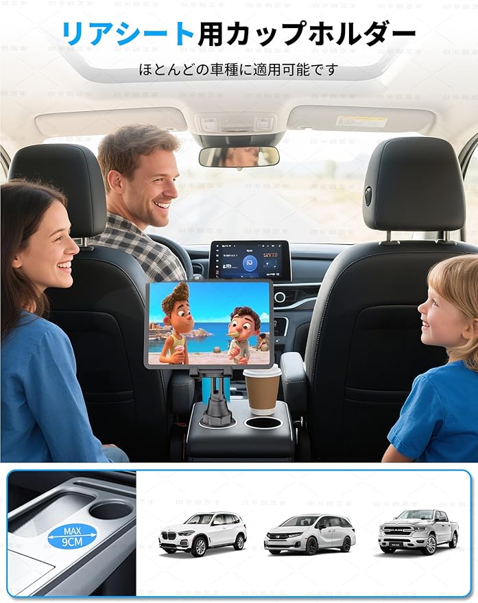 【タブレット&スマートフォン対応】: この車載カップホルダー用タブレットホルダーは、約15センチから29センチのデバイスに対応します。iPad Pro 12.9、11、10.5、10.2、9.7、iPad Air 4、3、2、1、iPad Mini 5、4、3、2、1、iPad 8、7、6、5、4、3、2、1、スマートフォンではiPhone 16、16 Pro、16 Pro Max、iPhone 15、15 Pro、15 Pro Max、iPhone 14、14 Pro、14 Pro Max、iPhone 13、13 Pro、13 Pro Max、iPhone SE、iPhone 12、12 Pro、12 Pro Max、iPhone 11、XS、XS Max、XR、X、8 Plus、8、7、7 Plus、6 Plus、6、Samsung Galaxy Note 20、S21、S21+、S20+、S20 Ultra、S10+、Tabs、Galaxy Note、Galaxy Sシリーズなど、さまざまな携帯電話やタブレットデバイスに対応しています。