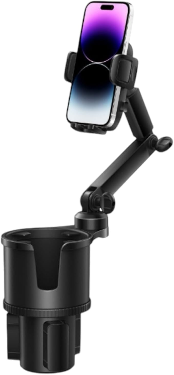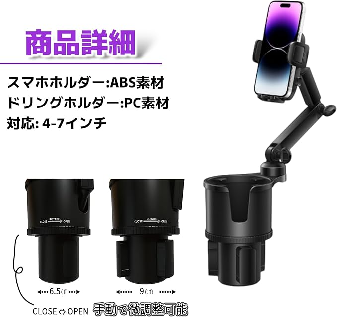 【簡単装着&ラクラク調整】 取り付けは誰でも簡単! 1. カップホルダーのつまみを回して車のカップホルダーにしっかり固定。 2. スマホホルダーはワンタッチで装着&取り外し可能。背面の調整ボタンで幅を自由に変えられます。 360度回転で自由な角度調整もでき、運転中でも視界を遮らず使いやすい設計です。