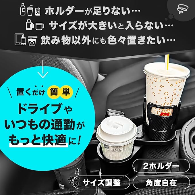 ダブルドリンクホルダー 車 ドリンクホルダー カップホルダー 拡張 増設 ダブルカップホルダー 車載 車内 車用 ドリンクホルダー 小物 車載ホルダー サイズ変更 角度自由 6.5cm ~ 9.5cm 工事不要