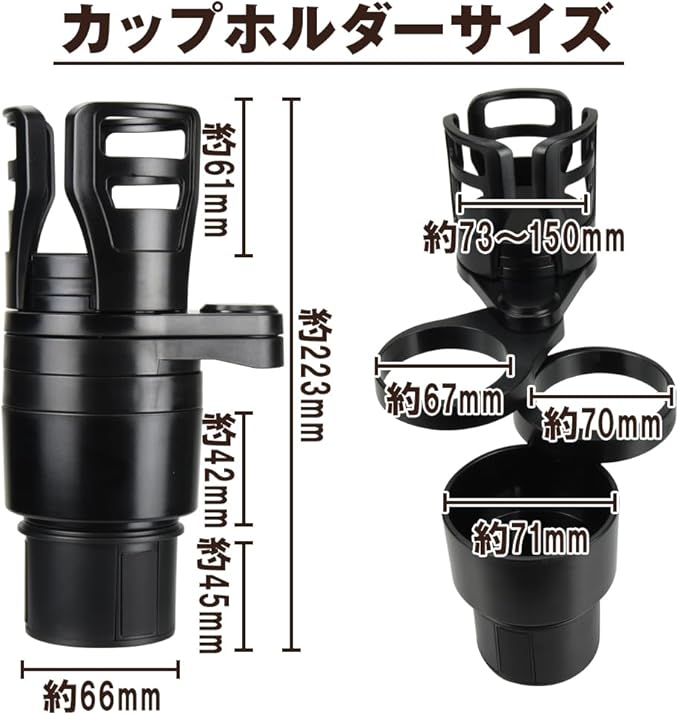 【セット内容】車内用カップホルダー 1点 【サイズ(約)】全長:223mm 【カラー】ブラック 【材質】ABS+PC