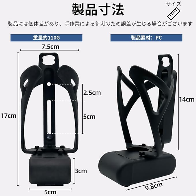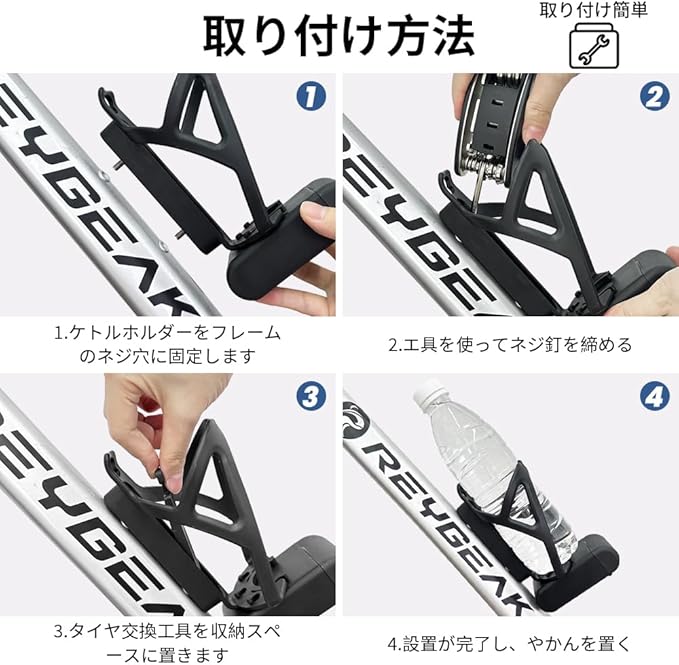 【取り付けが簡単】ダウンチューブやシートポストなどの自転車のフレームの標準ボトルケージマウントにネジを使用して簡単に取り付けられます。柔軟性の高いプラスチック素材はさまざまなボトルサイズと互換性があり、フレームを傷つけません。便利な取り付けのために六角レンチとネジが付属していま