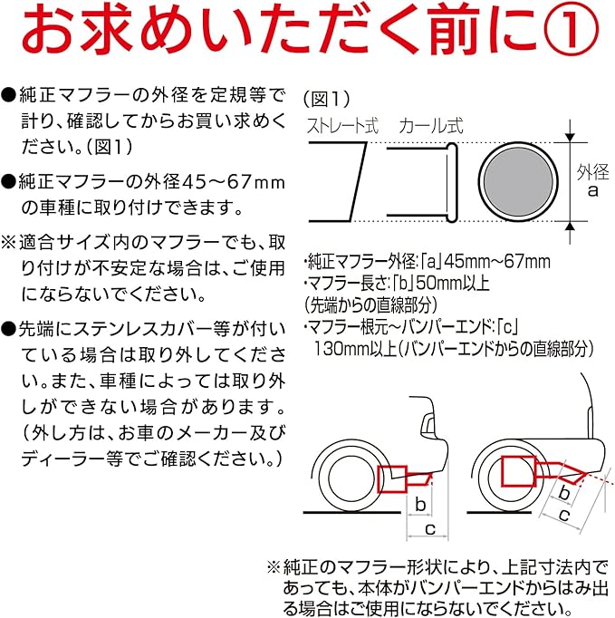 ●ボリューム感あふれるデザインで、リアビューの迫力とスポーティ感を大幅にUPさせます。 ●高硬度ステンレス(SUS304)使用で軽量で錆びにくいマフラーカッターです。 ●インナーメッシュによりスポーティ感を演出します。 ●特殊ネジ(イモネジ)2本とコの字金具で取りつけるので確実な取り付けが可能です。 ●特殊ネジ(イモネジ)を使用しているので、違和感のない装着が可能です。 ●付属工具付きなので取り付けの際、他の工具の用意の必要はありません。