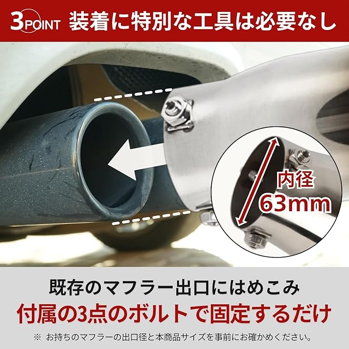 【手軽にカスタマイズ】 工具が少なくても簡単に取付可能。付属のネジを占めるだけでOK!愛車を大掛かりな改造なしでカスタマイズできるので、初心者から上級者まで幅広くおすすめ。ドレスアップだけでなく、排気音にも程よい変化を与え、走行時の存在感をアップさせます。 【幅広い車種に対応】 当商品は内径35~63mmに対応する汎用設計。愛車のマフラー外径を計測しサイズに収まれば普通車・軽自動車・スポーツカー・SUV・トラックまで幅広く装着可能です。車検対応を意識したシンプルデザインで、日常使用からカスタムシーンまで幅広く活躍します。