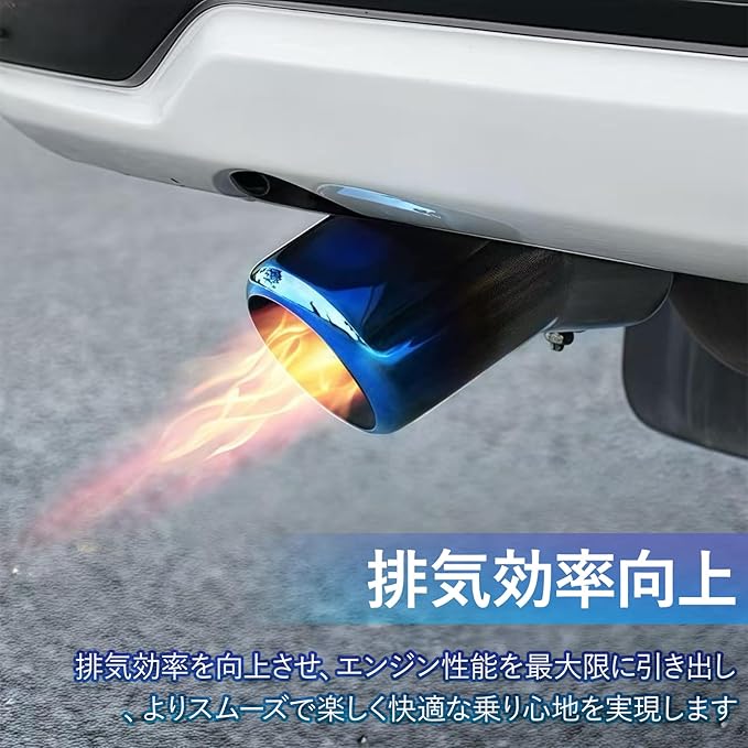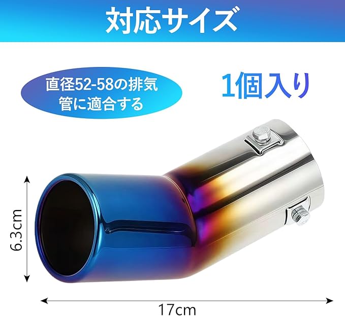 ✅【対応サイズ】このマフラーカッター は長さ約17cm、直径約6.3cmで、取り付け径は52~58mmです。大口径設計により、排気抵抗を効果的に低減し、排気効率を向上させます。