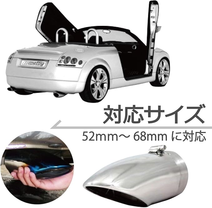 様々な車種に対応。耐食性、耐久性抜群。サビにくく、マフラーカッターにオススメのステンレス製です。 1.46mmの厚さがあり、しっかりとしています。下向き対応。汚れ防止にも。