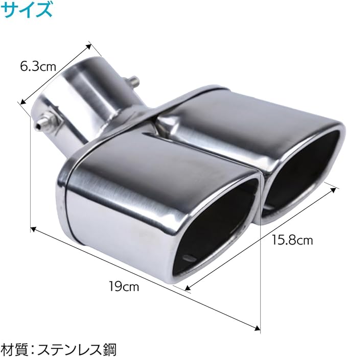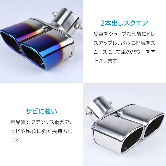 2本出しスクエアデザインのマフラーカッターです。愛車をシャープな印象にドレスアップし、さらに排気をスムーズにして車のパワーを向上させます。