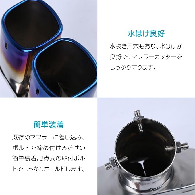 高品質なステンレス鋼製で、サビや腐食に強く長持ちします。水抜き用穴もあり、水はけが良好で、マフラーカッターをしっかり守ります。