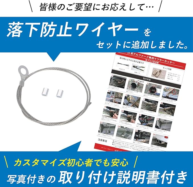 【あると嬉しい3点セット付き】 (1)落下防止ワイヤー ⇒ 走行中の落下の心配がありません。(2)マイクロファイバークロス ⇒ 愛車のお掃除に。吸水性・速乾性に優れてます。(3)取り付け説明書 ⇒ カスタム初心者でも安心の写真付き取付説明書。