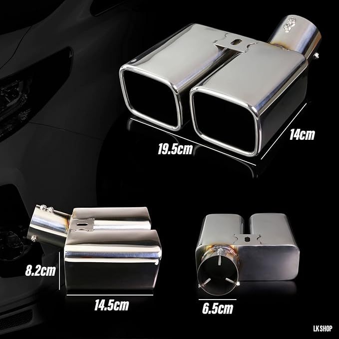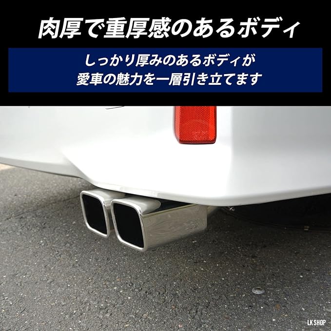 肉厚で重厚感のあるステンレス製マフラーカッターです。スクエア2本出し形状で、やんちゃ過ぎず大人しくスタイリッシュな雰囲気が魅力。
