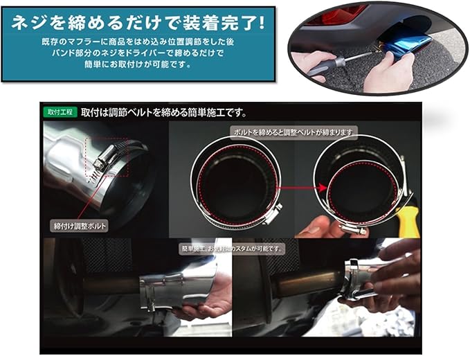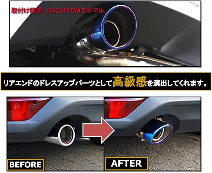 迫力の スラッシュカット /シングルタイプの マフラーカッター です。 ✅ チタン焼 入色調のため、 リアエンド の ドレスアップ パーツ として 演出してくれます。 ✅ 取り付け方法も既存のマフラーにはめ込こみ、 ステー を ボルト で締め付けるだけで簡単に装着可能となっています。 ✅ 本体には 錆 予防用穴が付けてありますので、雨天運転の時に水を抜くのを加速することにより、従来型より錆びにくくなります。 ✅ 後付け感をかんじさせないドレスアップが可能です。