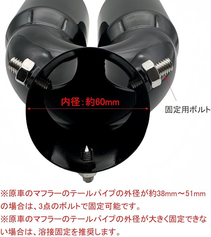 原車のマフラーのテールパイプの外径が約38mm~51mmの場合は、3点のボルトで固定可能です。